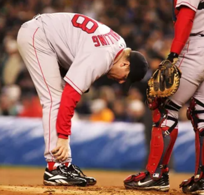 시리즈의 분수령이 된 6차전 보스턴의 선발은 발목 부상 중인 커트 실링이었습니다. 발목 인대가 끊어져 정상적인 투구가 불가능했던 실링은 그 전날 끊어진 인대를 임시로 다른 근육에 붙이는 ‘미친 결정’을 내리고 마운드에 오릅니다. 수술 때문에 발목에 피는 계속 새어나와 양말을 빨갛게 물들였지만, 실링은 7이닝 4피안타 1실점 호투를 펼치며 팀 승리를 이끌어냅니다. 세간에는 실링이 멀쩡한데 일부로 요오드 용액을 부었다는 등의 루머도 있었지만, 관계자들의 증언에 의하면 실제 피였던 것으로 밝혀졌습니다.
