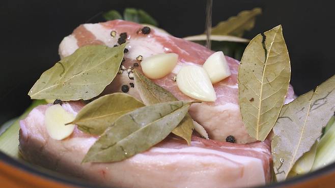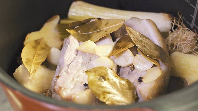 그리고 반드시 월계수 잎 3장 정도를 넣으세요. 월계수 잎은 돼지 누린내를 잡아 함께 넣으면 아주 좋답니다. 향이 처음엔 강할 수 있으니 익숙지 않은 분이라면 3장만 넣으세요. 저는 7장 정도 넣어 주었답니다.