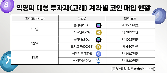 전날(12일)에도 글로벌 가상화폐 거래소에서 솔라나와 도지코인의 대규모 매수 체결이 이뤄졌다. 12일 솔라나는 세계 최대 규모의 가상화폐 거래소 바이낸스에 연동된 한 계좌에서 약 7235만달러(원화 약 1035억원)의 매수 물량이 체결됐다. 같은날 도지코인은 약 4472만달러(원화 약 640억원) 규모의 물량이 로빈후드의 한 계좌에서 매수됐다. 앞서 11일 오후에는 바이낸스에서 각각 1억달러(원화 약 1400억원)가 넘는 규모의 이더리움과 에이다 거래가 체결됐다.