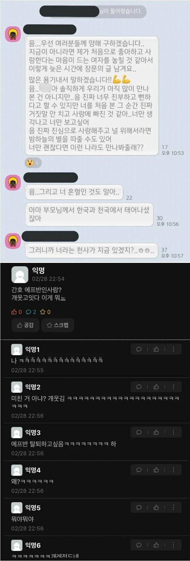 어느 대학교 단톡방에서 혼혈에게 고백한 남자