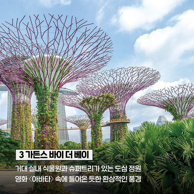 거대한 미래 도시를 보는 듯한 가든스 바이 더 베이. 철근과 콘크리트로 짜인 뼈대에 높이가 25~50미터에 이르는 인공 나무들이 200여 종 16만 포기 이상의 식물로 빼곡히 덮여 있습니다. 슈퍼트리는 밤이 되면 화려하게 조명을 밝혀 비현실적인 풍경을 보여줍니다.