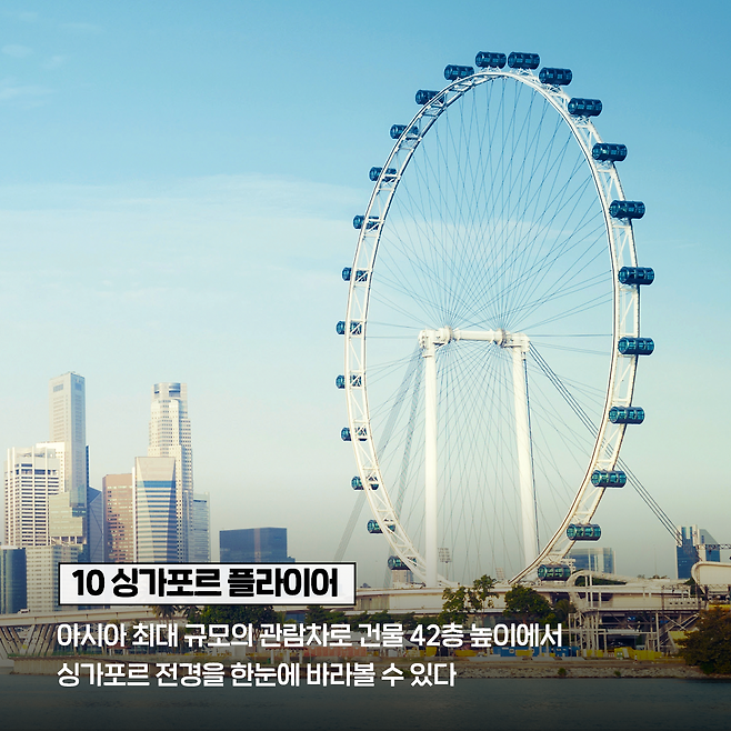 파리에 에펠탑이 있다면 싱가포르에는 마리나 베이 샌즈가 있어요. 위쪽의 배 부분에 있는 인피니티 풀은 언제나 인증샷 찍는 사람들로 붐비는 곳이에요. 57층 높이에서 바라보는 싱가포르의 야경은 그야말로 장관입니다.