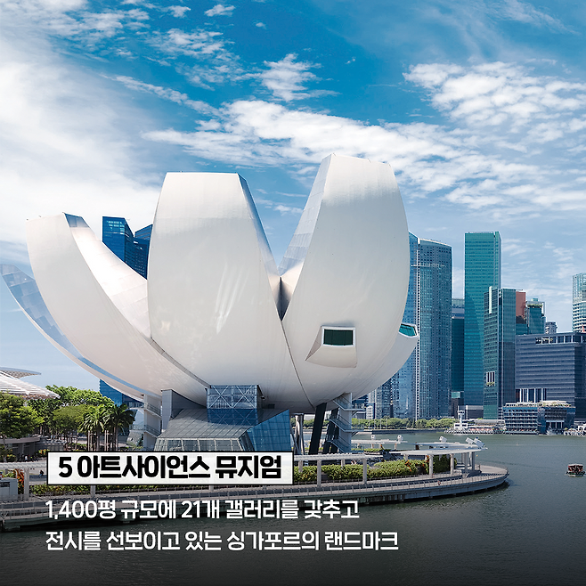 연꽃 같기도 하고 우주선 같기도 한 뮤지엄 건물은 위에서 내려다볼 때 싱가포르에 온 것을 환영하는 듯한 모양이라 ‘환영의 손’이라 불립니다. 미국 자연사 박물관, 도쿄 모리 미술관 등 전 세계 유명 박물관 및 갤러리와 협업해 수준 높은 전시를 선보이고 있어요.