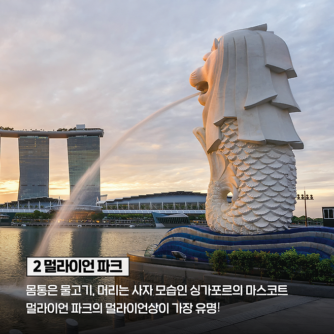 싱가포르의 공식 마스코트 ‘멀라이언’. 멀라이언 파크에 위치한 멀라이언상은 8.6미터 높이로 입에서 물을 뿜고 있는 모습이에요. 많은 관광객들의 인증샷에 빠지지 않고 등장하는 곳입니다.