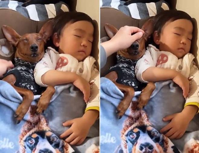 아무래도 강아지는 자기가 사람이라도 되는 줄 아는 모양입니다. 사이좋게 이불을 나눠서 덮은 채 잠든 아기와 강아지 모습 정말 사랑스러운데요.