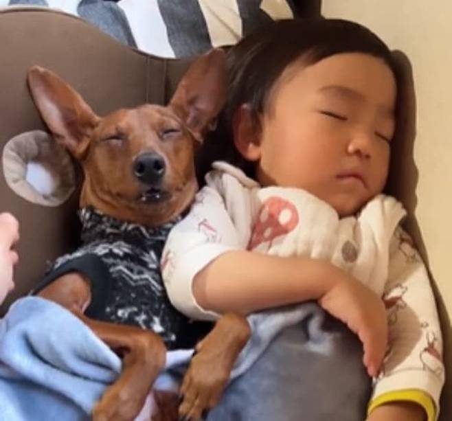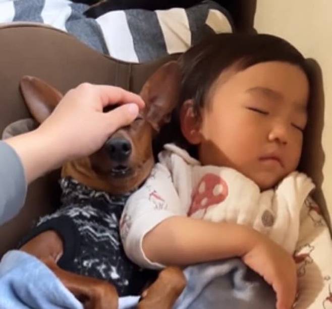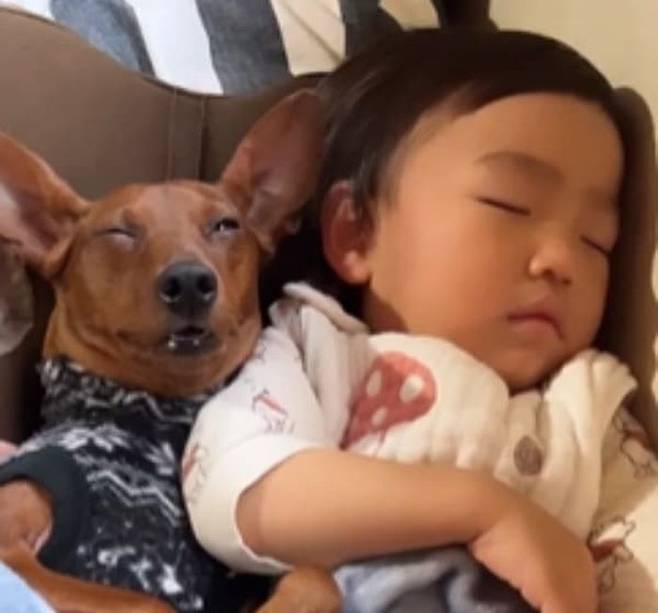 이날 강아지는 아기랑 떨어직 싫어서 옆에 붙어 있다가 밀려오는 졸음을 참지 못하고 잠든 것이라고 합니다.