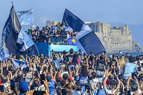epa12137040 Napoli players greet fans from atop a bus during the team's victory parade at Caracciolo seafront, Naples, Italy, 26 May 2025. Napoli sealed the fourth Serie A title in their final league match of the season. EPA/CIRO FUSCO