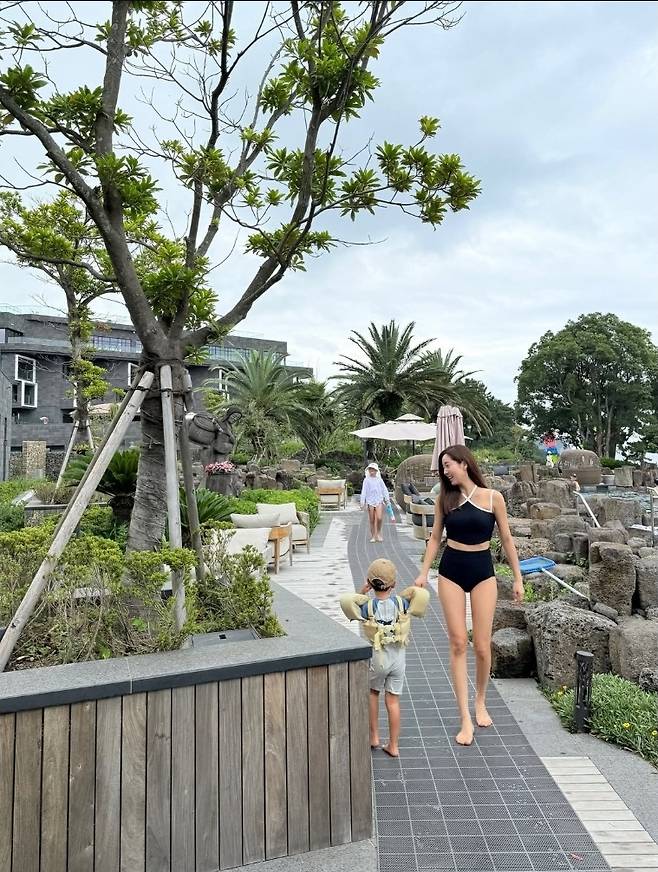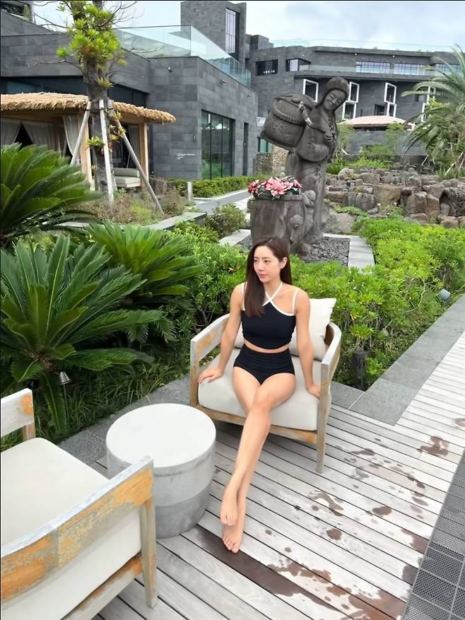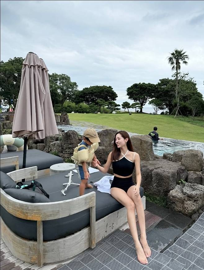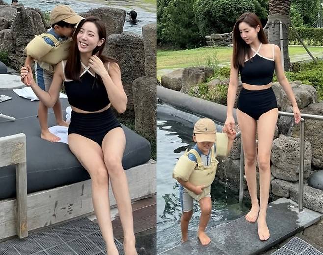 정순주는 심플하면서도 세련된 블랙 크로스 스트랩 수영복을 선택해 육아맘의 비현실적인 몸매를 선보였습니다.