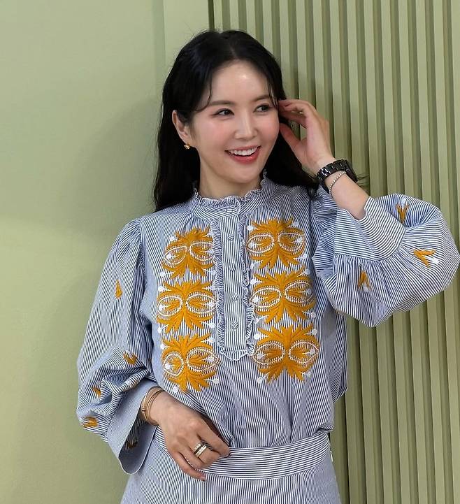 장영란이 특유의 밝은 에너지와 어우러지는 경쾌한 여름 스타일링으로 눈길을 끌었다. 스트라이프 패턴 위에 옐로우 자수가 돋보이는 블라우스를 착용한 그는 환한 미소와 함께 '보기만 해도 기분 좋아지는 패션'을 완성했다.