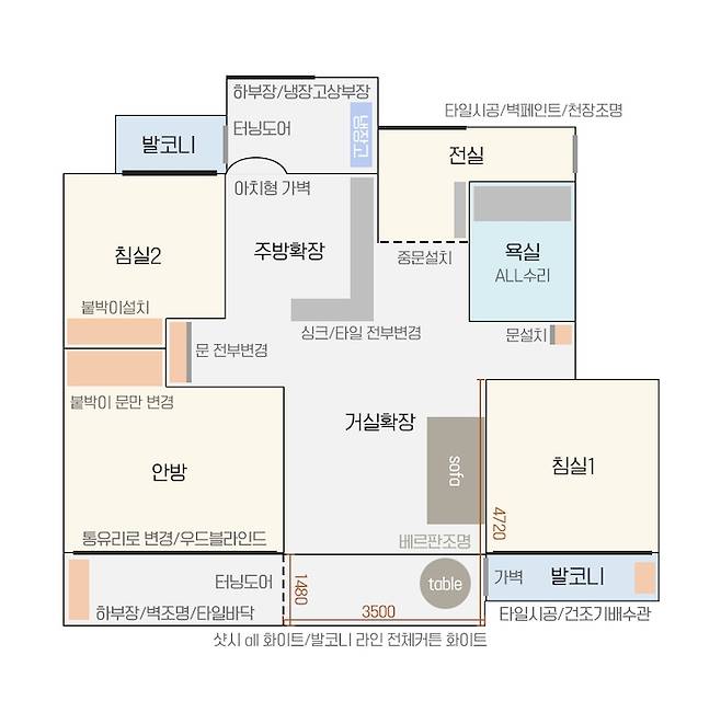 소형가전들이 은근 자리 차지를 많이 해요. 커피 머신은 베란다에 놨으니 해결됐고, 밥솥은 아일랜드장 아래쪽에, 전자레인지와 에어프라이기는 창문 아래 하부장에 넣을 계획으로 미리 전기 작업을 해놨어요. 바깥으로 보이지 않으니 훨씬 더 넓어 보이죠.