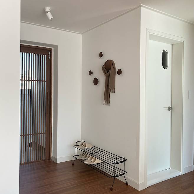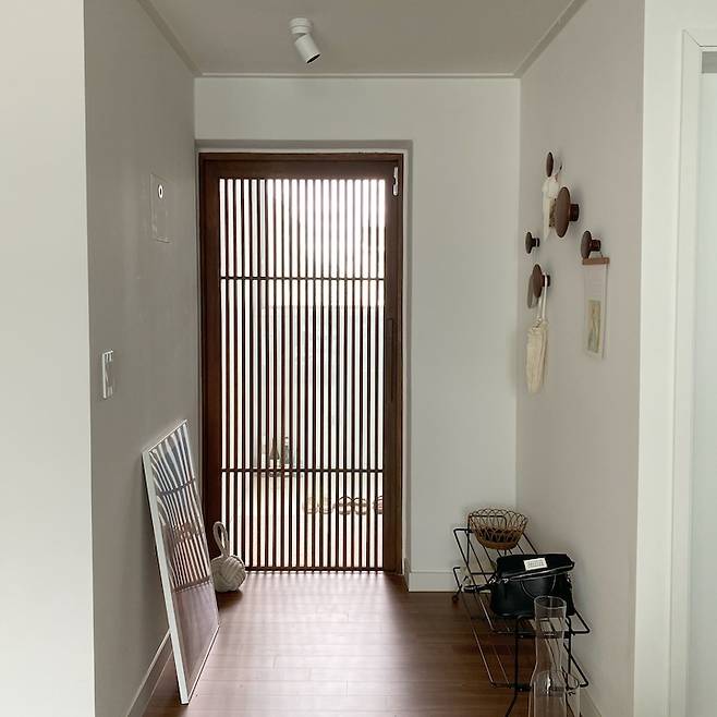 지금의 중문이 있는 자리엔 현관이 있었고 그 안쪽으론 신발장이 있었어요. 공간을 더 넓게 쓰고 싶어서 신발장을 중문 밖으로 빼고 타일 바닥이었던 안쪽 공간을 거실로 쓰기 위해 마루를 깔았어요. 신발장이 있는 바깥은 보너스 공간인 전실인데 택배 박스나 각종 잡동사니를 두곤 합니다. 아주 유용한 공간이이에요.