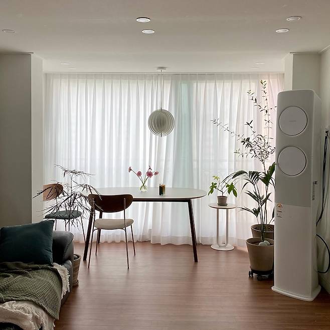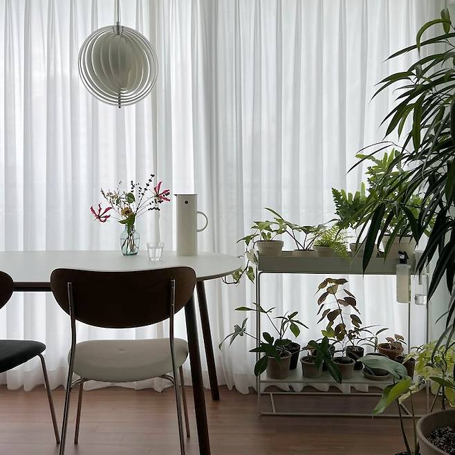 식물을 키우는 집이기 때문에 계절에 따른 공간 변화가 있어요. 추운 날을 대비해서 베란다에 있는 식물들 위치를 조정하고 추위를 싫어하는 식물들은 거실로 들여야 하기 때문이죠. 식물의 개수가 많고 창가에 다 둘 수 없어서 식물 등을 구입했고 여기저기 배치했어요.