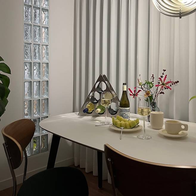 유리블록은 뒤에 공간을 가려주면서도 빛을 통과해서 거실이 어둡지 않게 해줘요. 낮엔 자연광이 들어오고 밤엔 작은방 베란다 조명을 키면 빛이 테이블에 물결처럼 비춰줘요. 확실한 포인트가 된 것 같아요.