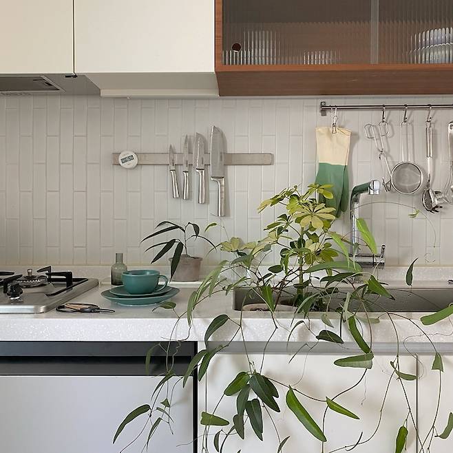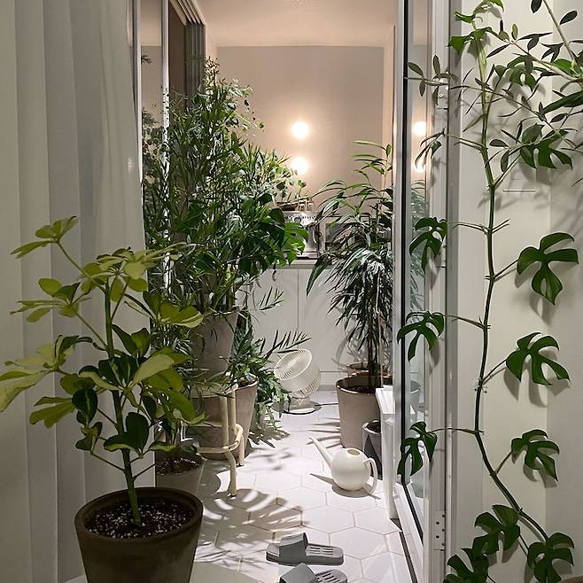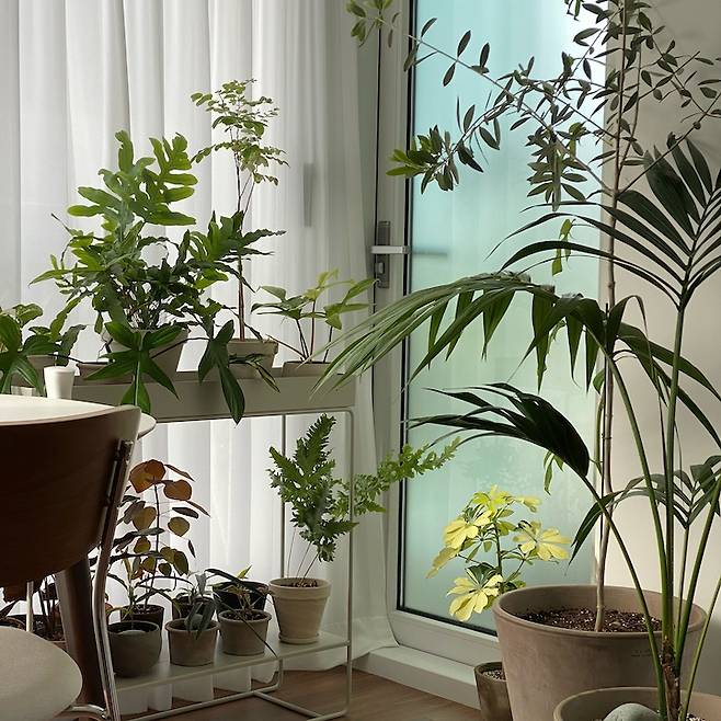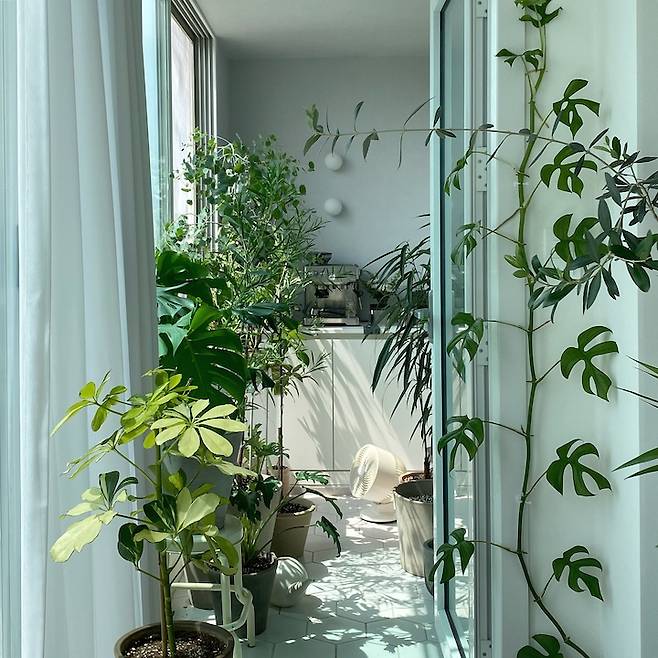 공간은 한정적이고 식물은 건강하지 못한 채 늘어가니 결국엔 식태기가 오더라고요. 이사 오기 전까지 식물을 많이 놓았던 거 같아요. 그래서 지금의 집을 고를 때 제일 중요하게 본 두 가지 중 첫 번째는 베란다, 두 번째는 햇빛이었어요. 베란다에서 아쿠아건으로 식물들에게 물을 줄 때 얼마나 뿌듯한지 몰라요. 세상 편한 가드닝~