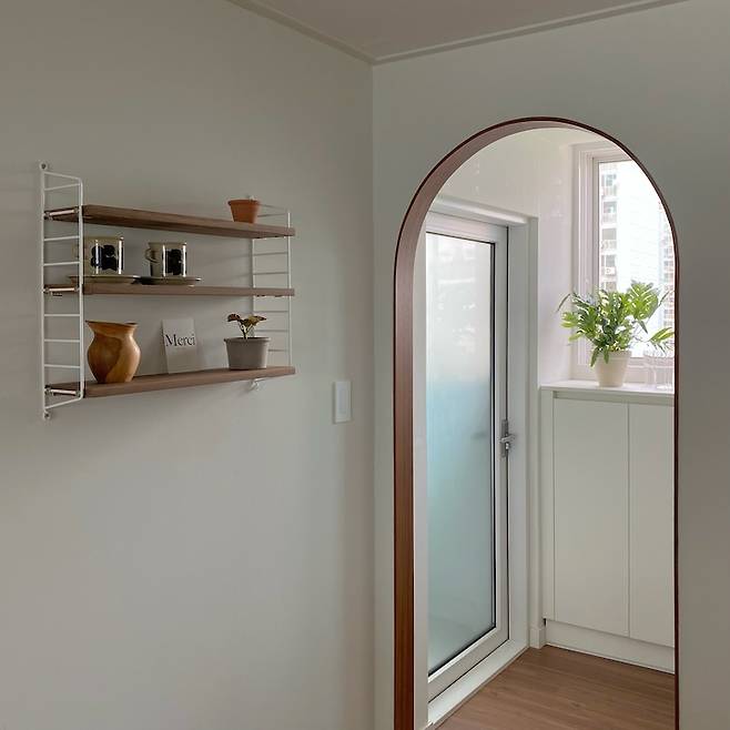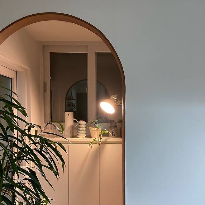 참고로 리모델링 하면서 어딘가엔 꼭 아치를 넣고 싶어서, 홈 카페 도어를 아치형 통로로 하려고 했어요. 그런데 베란다는 배수관이 있어서 물 내려가는 소리가 크게 들릴 수 있다고 하더라고요. 그래서 홈 카페 도어는 터닝 도어로 결정했어요. 오히려 더 따뜻하게 지낼 수 있어서 좋아요.