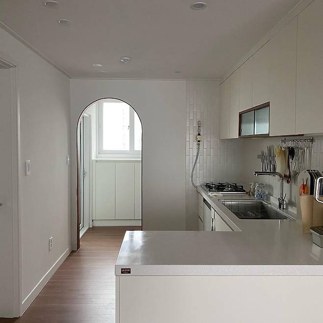주방 확장을 하면서 기존에 있던 문을 철거하고 이쪽에 아치형 통로를 넣었어요. 냉장고와 쓰레기통을 뒤에 숨겨두고 쓰니 오히려 깔끔한 주방이 완성된 거 같아요.