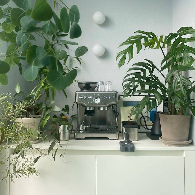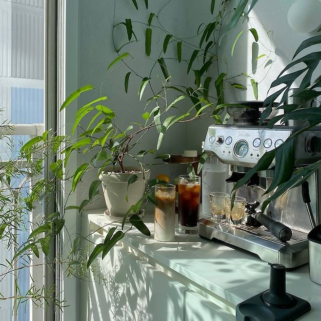 그날 날씨에 따라 촉촉한 풀 냄새가 나기도 하고 커피향이 가득 채워질 때도 있어요. 바라보면서 풀멍을 하기도 해요. 재택근무가 길어지면서 집에 있는 시간이 많으니 식물들을 돌보는 시간도 늘어났거든요. 가장 애정하고 손이 많이 가는 공간이에요.