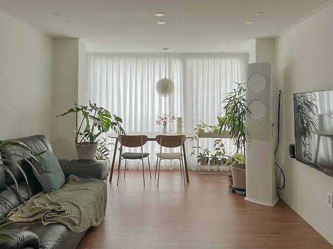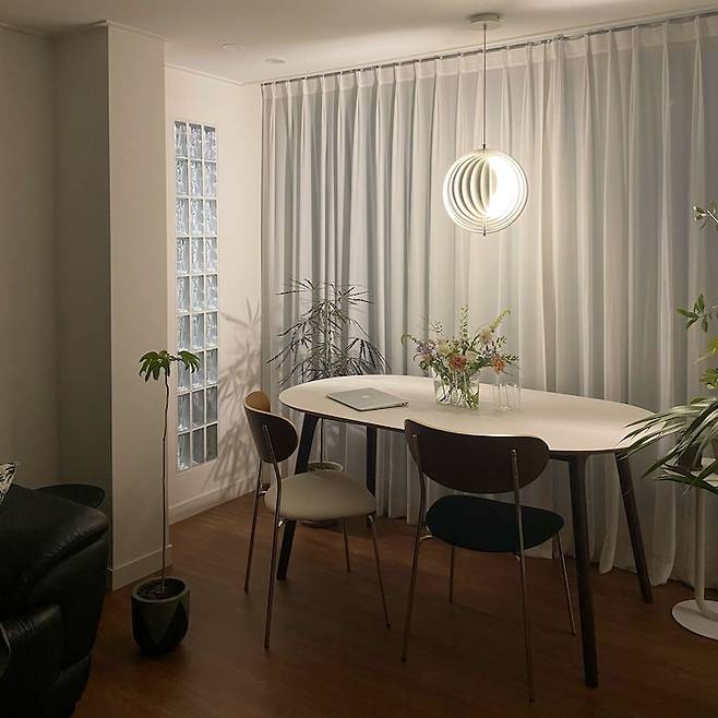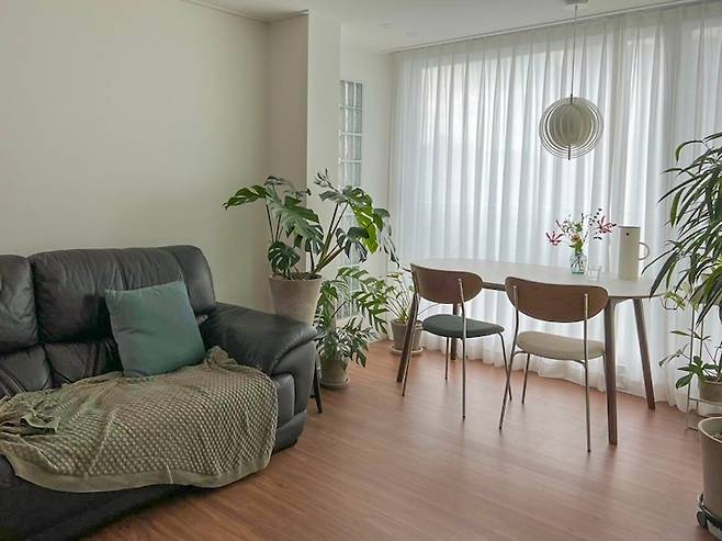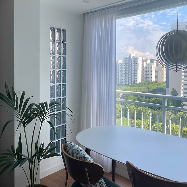거실은 남편과 가장 많은 시간을 보내는 공간이죠. 좁은 주방을 대신해 식탁을 거실 창가에 뒀어요.