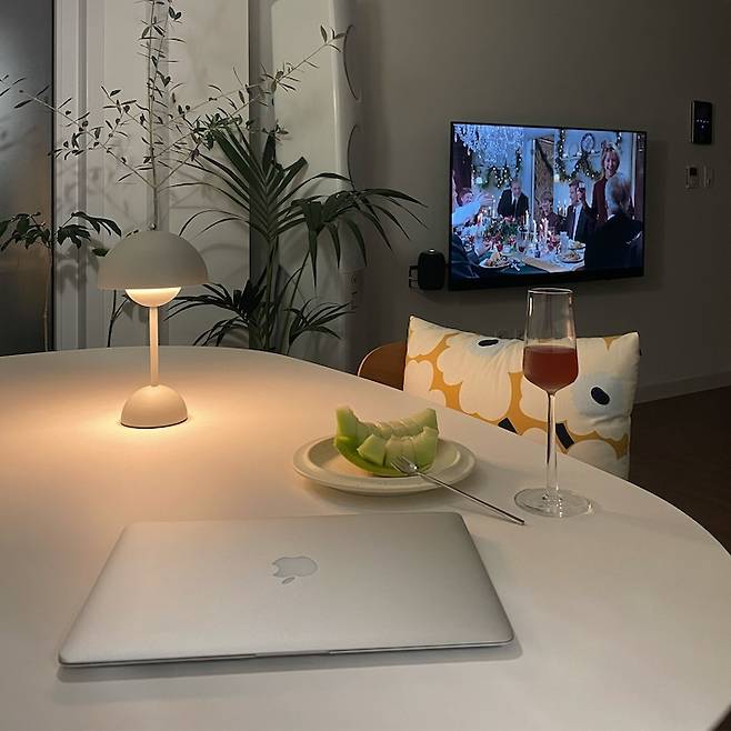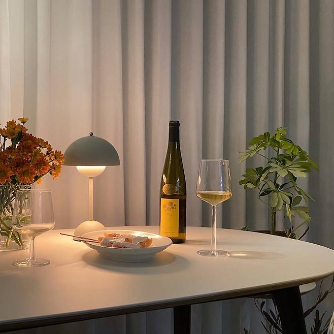 TV를 사랑하는 남편은 주말 저녁마다 영화를 보면서 맛있는 음식 먹는 걸 좋아해요. 술을 잘 못하는 저는 요즘 와인 한 잔씩 마시는 걸 좋아하고요. 덕분에 거실은 와인바가 되기도 하고 영화관이 되기도 하죠.