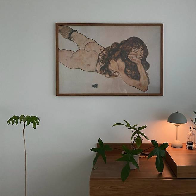마음에 드는 그림을 찾는 데 한참 걸렸는데 에곤 쉴레 그림이 와 닿았고 벽에 걸었어요. 가구들과도 잘 어울려서 저희 집 침실에 찰떡이에요.