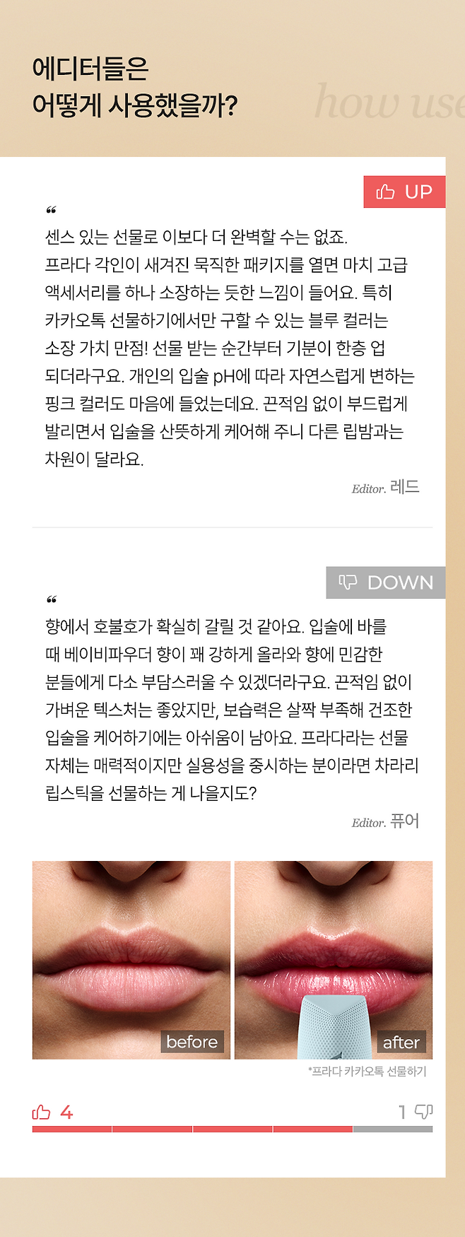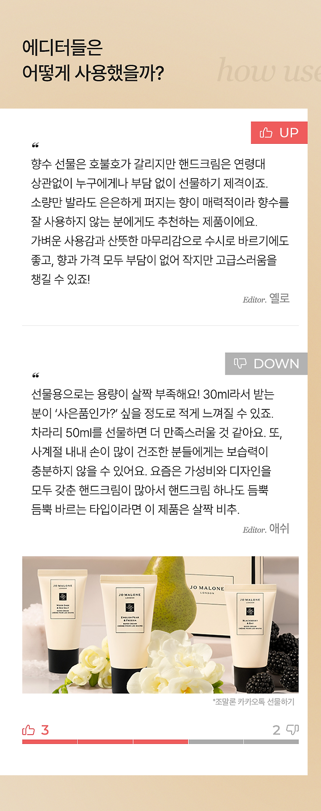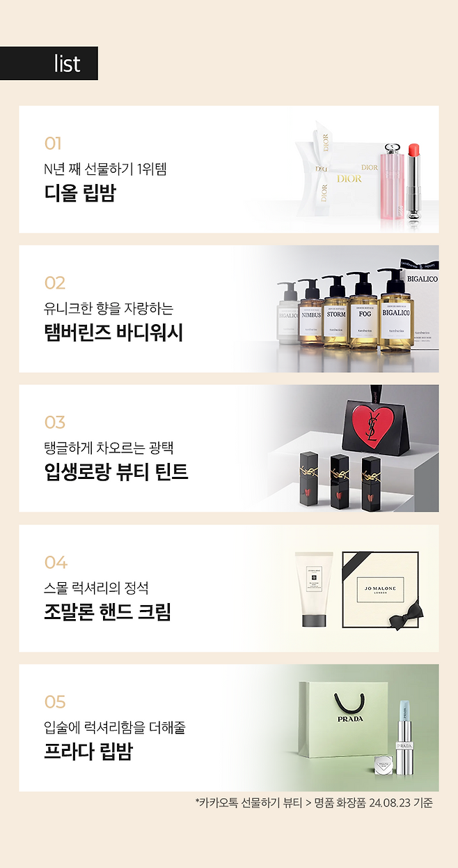 [에디터 UP & DOWN] 카카오톡 선물하기 높은 순위에 있는 아이템은 주는 사람도 받는 사람도 모두 만족할까? 뷰티 카테고리 중에서도 명품 화장품 BEST 5 아이템을 직접 사용해 본 에디터 5인의 리얼 후기를 참고해 보세요.