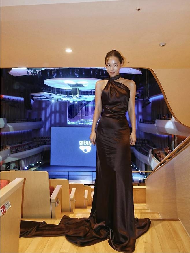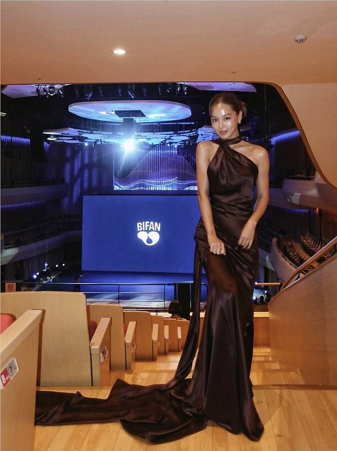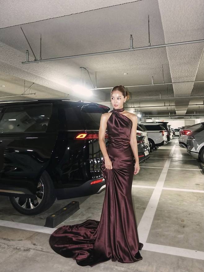 김희정은 초콜릿빛 새틴 드레스를 입고 등장해 시선을 사로잡았습니다.