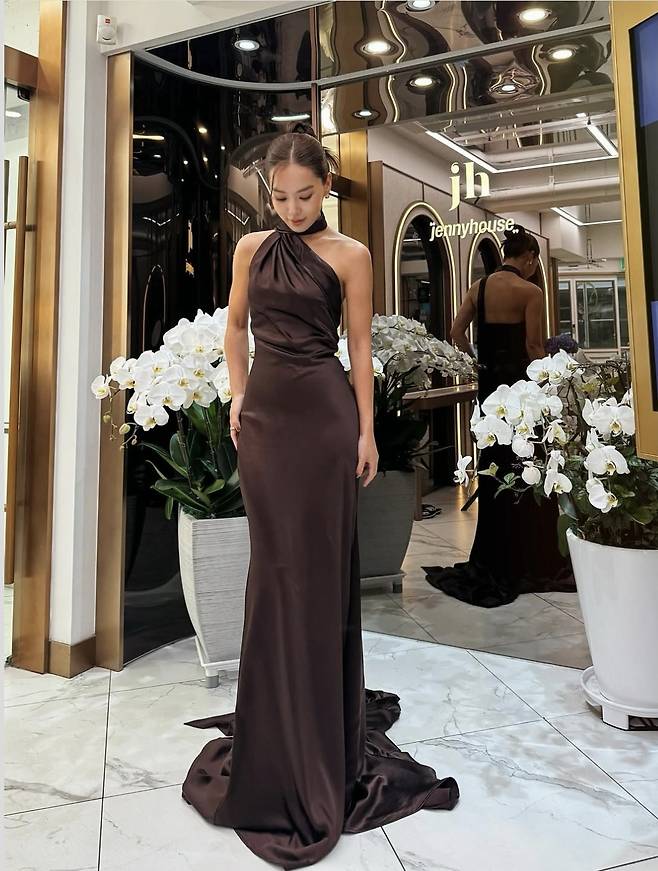 넥라인을 감싸는 홀터넥 디자인과 허리부터 쭉 뻗은 슬릿 디테일이 우아한 바디라인을 돋보이게 했습니다.