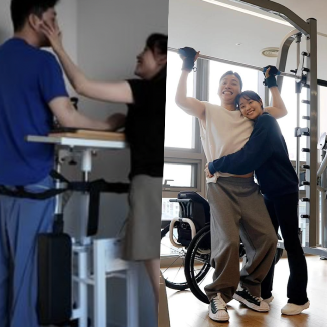 영상 속 박위는 헬스장에서 친구들의 도움을 받아 철봉에 의지해 휠체어에서 일어섰다. “힘들지, 내가 도와줄까?”라는 아내의 물음에 박위는 웃음을 터트리며 "나 안아줘"라며 애정을 드러냈다.
