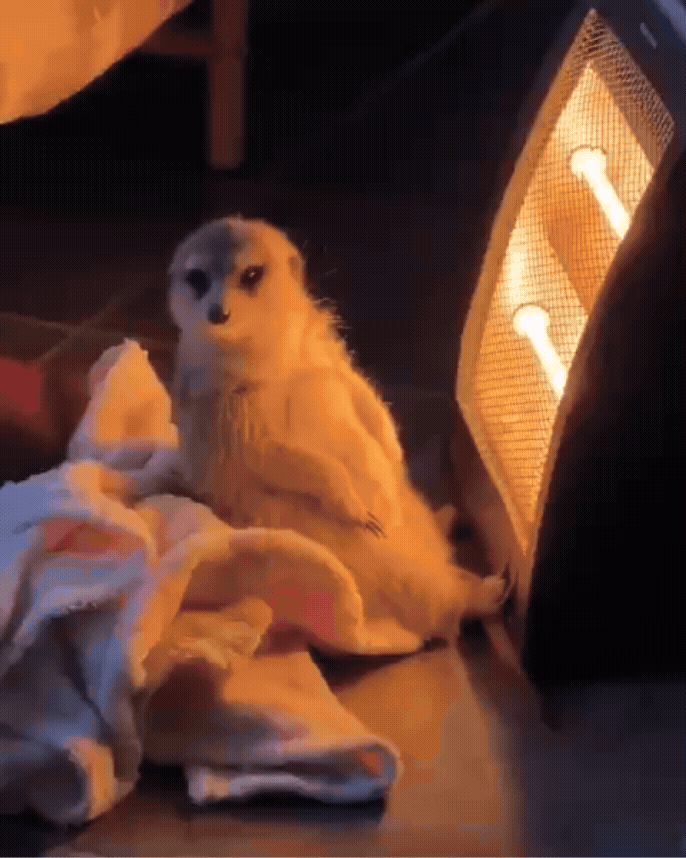 찬 바람이 부는 겨울, 이 미어캣은 자신만의 완벽한 안식처를 찾았습니다. 바로 따스한 주황빛 빛을 뿜어내는 전기히터 앞인데요. 처음에는 나름 미어캣답게 꼿꼿하게 앉아 온기를 즐기는 듯하더니, 얼마 지나지 않아 긴장이 풀렸는지 몸을 뒤로 스르르 젖히기 시작합니다. 마치 뜨끈한 온탕에 몸을 담근 뒤 "어우, 시원하다~"라고 감탄사를 내뱉는 우리네 아버님들의 모습이 겹쳐 보여 웃음을 자아냅니다.