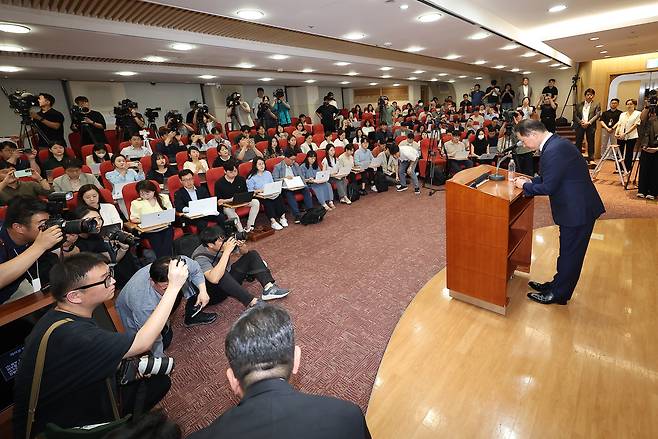 | ▲ 최태원 SK그룹 회장이 17일 오전 서울 종로구 SK서린빌딩에서 노소영 아트나비센터 관장과의 이혼 소송 항소심 관련 입장에 대해 얘기를 마친 뒤 인사하고 있다. 2024.6.17 |