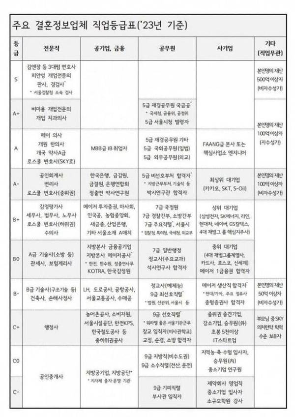 | ▲ 각종 온라인 커뮤니티에서 화제가 됐던 23년 '주요 결혼정보업체 직업등급표'다. S등급에는 3대로펌 변호사와 개업전문의, 판사 등이 있고, 가장 낮은 등급에 9급 공무원이나 중소기업 임직원 등이 배치됐다. |