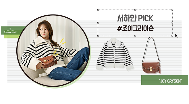 찾아보니 니트 스트라이프 집업과 가방은 조이그라이슨 제품이라고 해요!