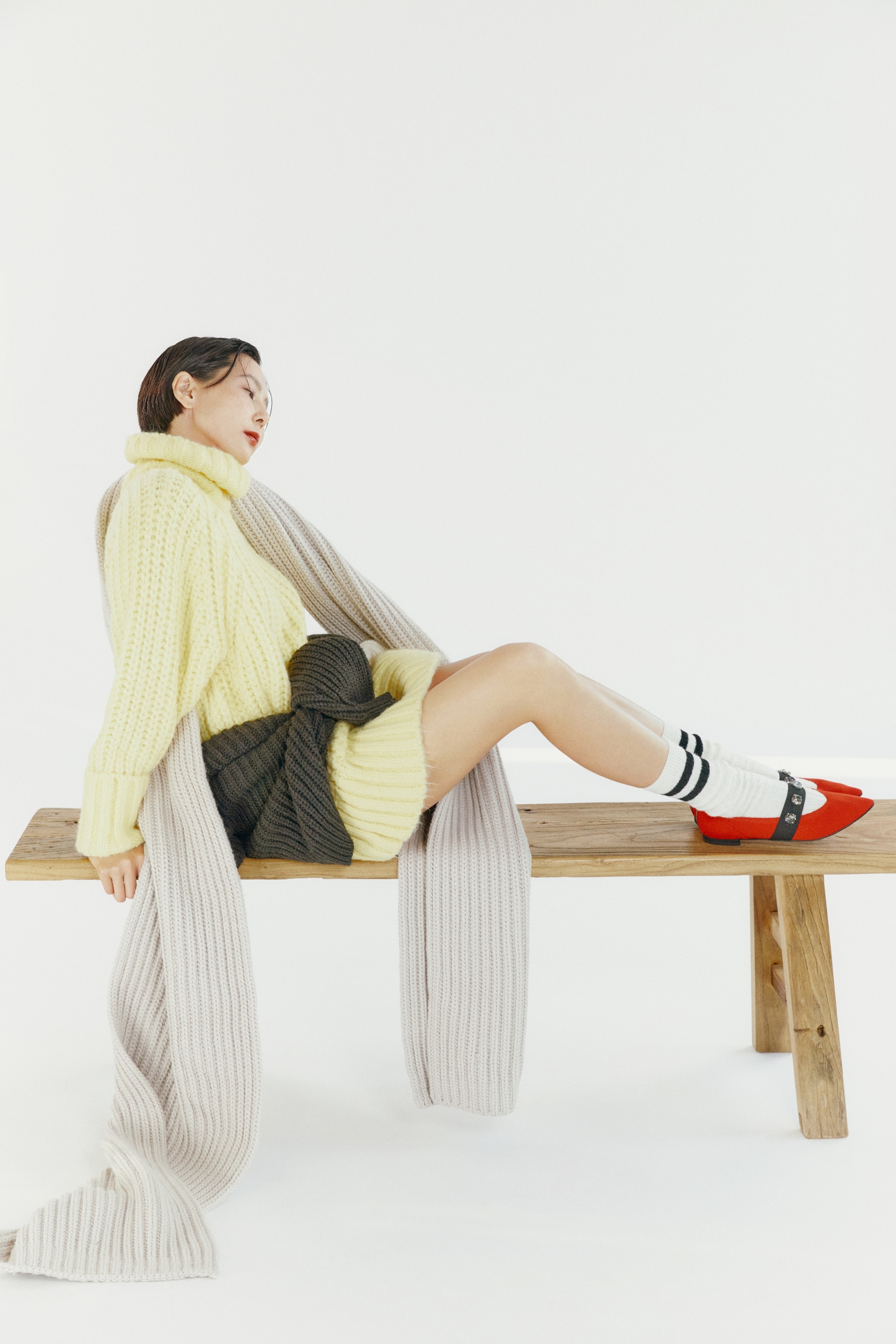 연노랑색의 터틀넥 니트에 베이지색 니트 머플러로