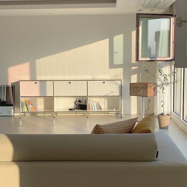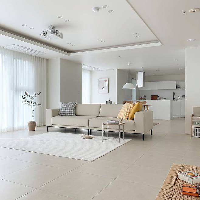 현관문을 열면 제일 먼저 보이는 거실은, 단순히 하얗기만 한 공간이 아닌 따뜻한 감정을 머금은 공간이에요. 모든 벽면은 흡광 도장을 사용해 빛을 부드럽게 반사하게 했고요.
