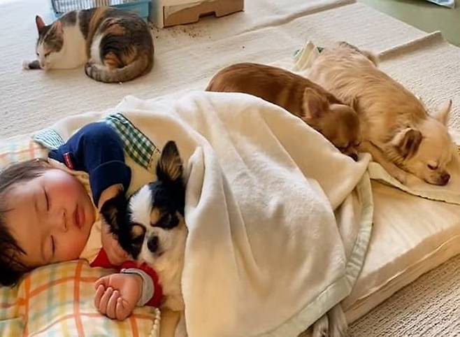 이날 피곤했는지 이불을 덮고 누워서 낮잠이 든 아기 주변으로 강아지와 고양이들이 조심스럽게 다가왔다고 합니다.