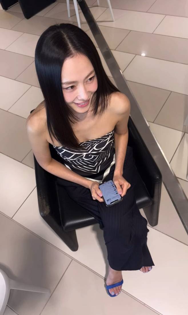 홍수현은 블랙과 화이트가 어우러진 패턴의 튜브탑을 선택해 세련된 무드를 연출했으며, 팬츠는 스트라이프 디테일이 가미된 슬랙스를 매치해 도시적인 감각을 더했습니다.