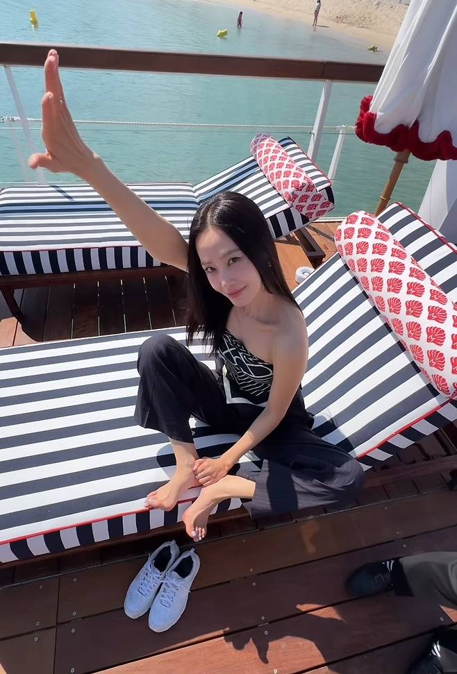 발끝까지 똑 떨어지는 블랙 핀스트라이프 팬츠는 각선미를 강조하며 슬림한 실루엣을 완성했고, 하늘빛 스트랩 힐로 포인트를 더해 이국적인 휴양지 감성을 완벽히 담아냈습니다.