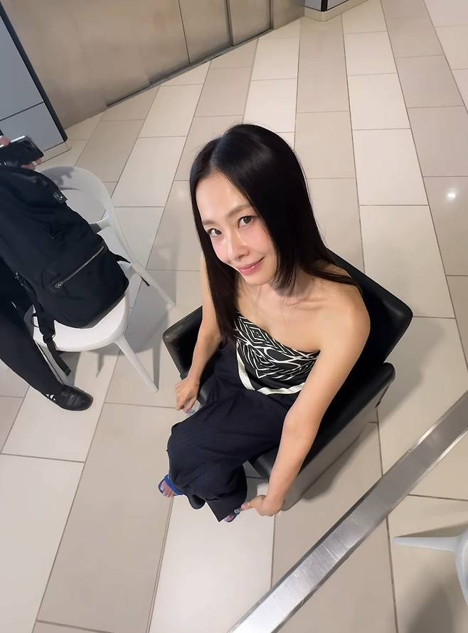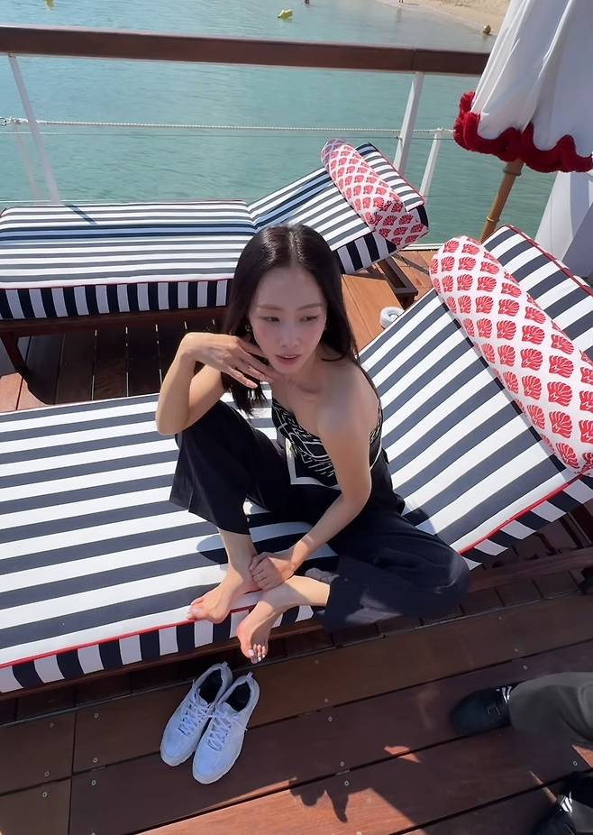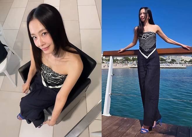 발끝까지 똑 떨어지는 블랙 핀스트라이프 팬츠는 각선미를 강조하며 슬림한 실루엣을 완성했고, 하늘빛 스트랩 힐로 포인트를 더해 이국적인 휴양지 감성을 완벽히 담아냈습니다.