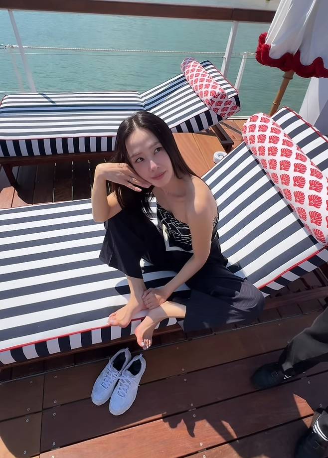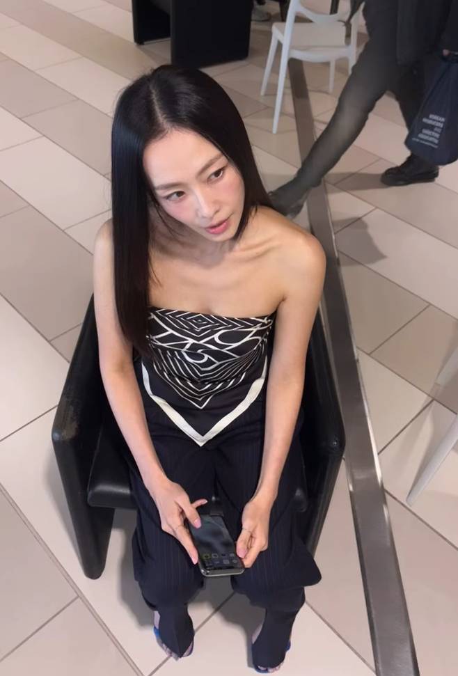 홍수현은 블랙과 화이트가 어우러진 패턴의 튜브탑을 선택해 세련된 무드를 연출했으며, 팬츠는 스트라이프 디테일이 가미된 슬랙스를 매치해 도시적인 감각을 더했습니다.