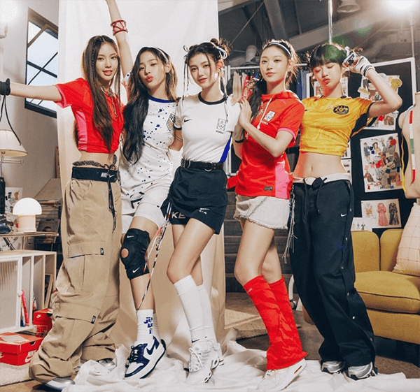 블록코어룩 하면 뉴진스의 무대의상을 떠올리는 사람들이 많을 것이다. attention 뮤비에서부터 블록코어룩을 입기 시작하여 얼마 전에는 나이키 국가대표팀 유니폼으로 스타일링을 해 화제를 일으켰다. 나이키의 호주, 미국, 대한민국 국가대표팀의 유니폼과 여러 다양한 헤어 스타일링과 양말이나 팬츠 등의 패션 아이템으로 함께 코디를 해서 뉴진스만의 스포티하면서도 활기차고 세련된 분위기를 선사했다.