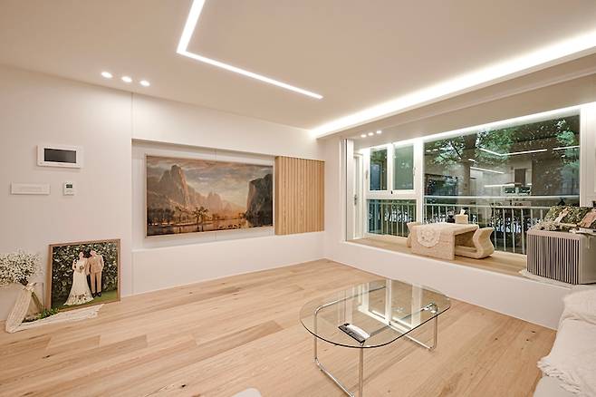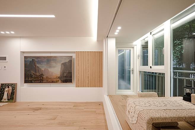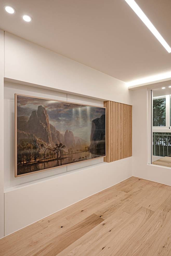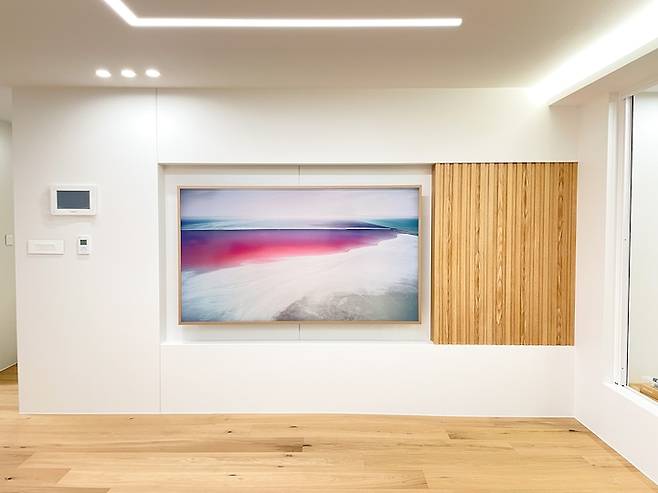 옆에는 목공으로 간살을 넣었는데, 필름이 TV 프레임과 같은 색상이어서 그런지 꼭 맞춤 제작한 것 같이 나왔어요! :) TV를 안 볼 때는 액자를 켜놓는 편이에요. 계절에 따라- 날씨에 따라 그림을 바꿔요. 그림 하나 바꿨을 뿐인데 집의 분위기가 좌우될 때면 남편과 함께 더 프레임 정말 잘 샀다고 쾌재를 부르곤 합니다!