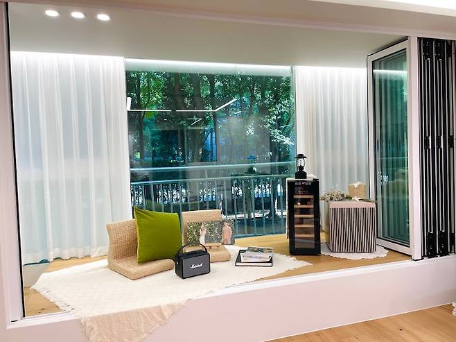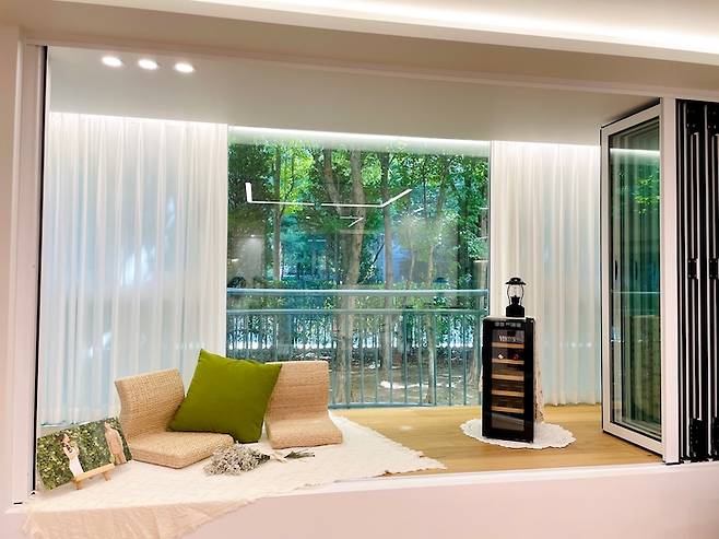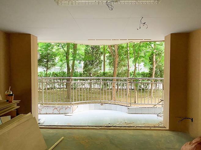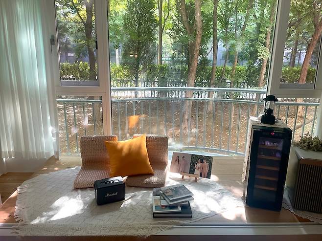 엘리베이터를 무서워하는 저는 처음부터 저층을 알아보다가 베란다 앞에 정원을 끼고 있는 이 초록 뷰를 보고 이 집이다! 싶었고, 그 순간 윈도우 시트를 만들어서 이곳에서 초록 뷰를 만끽해야지! 생각했던 것 같아요.