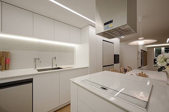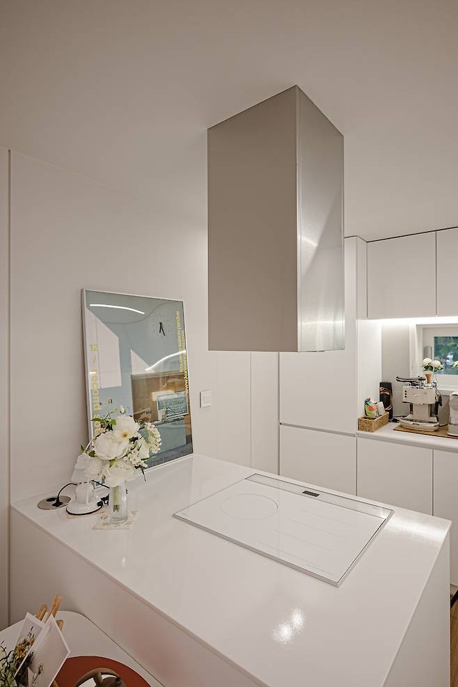 대면형 주방을 선택하면서, 인덕션을 아일랜드 위로 올렸어요. 대면형의 가장 큰 문제점은 후드입니다. 자바라를 사용해야 하는 국내 후드들은 상부장 안쪽으로 자바라를 가려야 하는데, 대면형은 장과 연결이 되지 않거든요.. 그래서 어쩔 수 없이 탄소 필터 후드를 선택했어요. 비스포크의 느낌과 비슷하도록 스퀘어로 선택했는데, 볼수록 참 예뻐요. 제가 시공할 때는 탄소 필터 종류가 많지 않았는데, 요즘은 예쁜 것들이 참 많이 나오더라고요. 몇 가지 안되는 선택지에서 선택한 것치고는 아주 훌륭한 결과입니다 :)