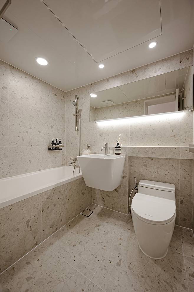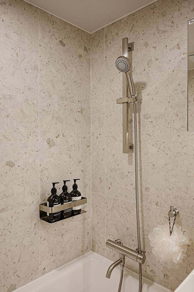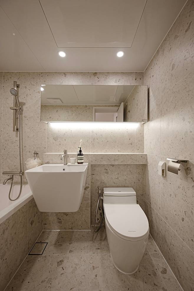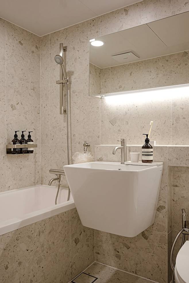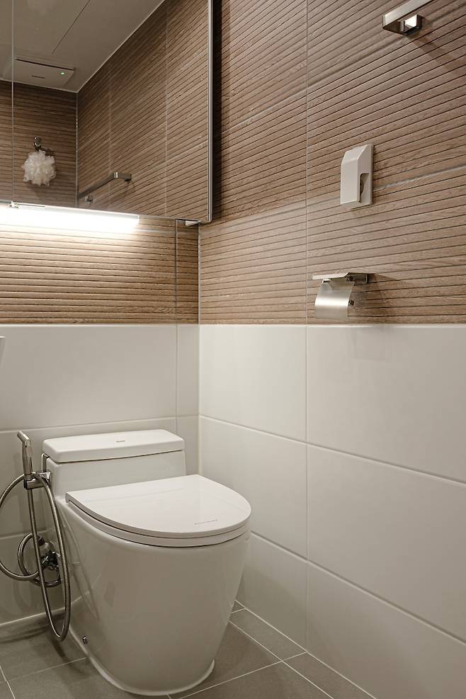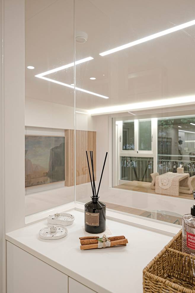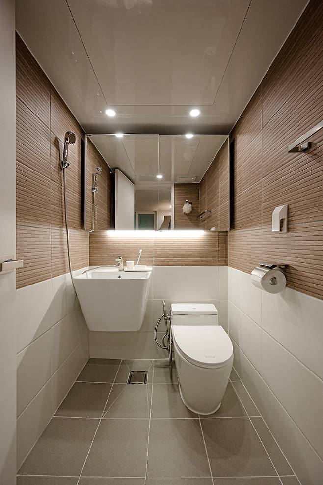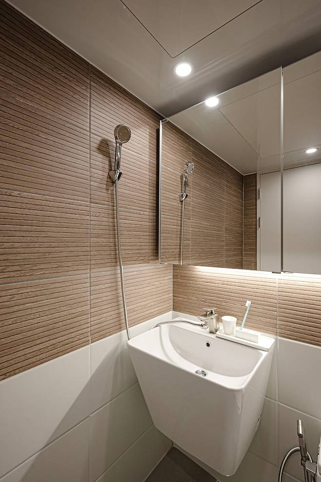슬라이드 장을 넣으며 거울을 통해 좀 더 넓게 보이는 효과를 주었습니다. 공용 욕실과 확실하게 다른 느낌을 주니까 색다르고 신선해요 :)