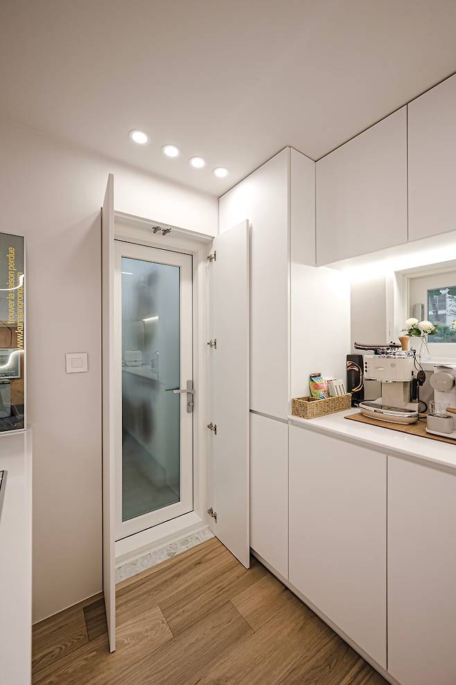 이렇게 세탁실로 들어가는 문도 히든 도어로 제작했어요. 물론 잘 안 보이는 곳이라서 터닝 도어만 설치해도 괜찮았겠지만, 통일성을 위해 히든 도어로 맞췄답니다 :) 점점 추워지며 터닝 도어에도 한기가 서리는데, 확실히 한 번 더 막아주니 방한과 소음에도 만족하는 부분입니다!