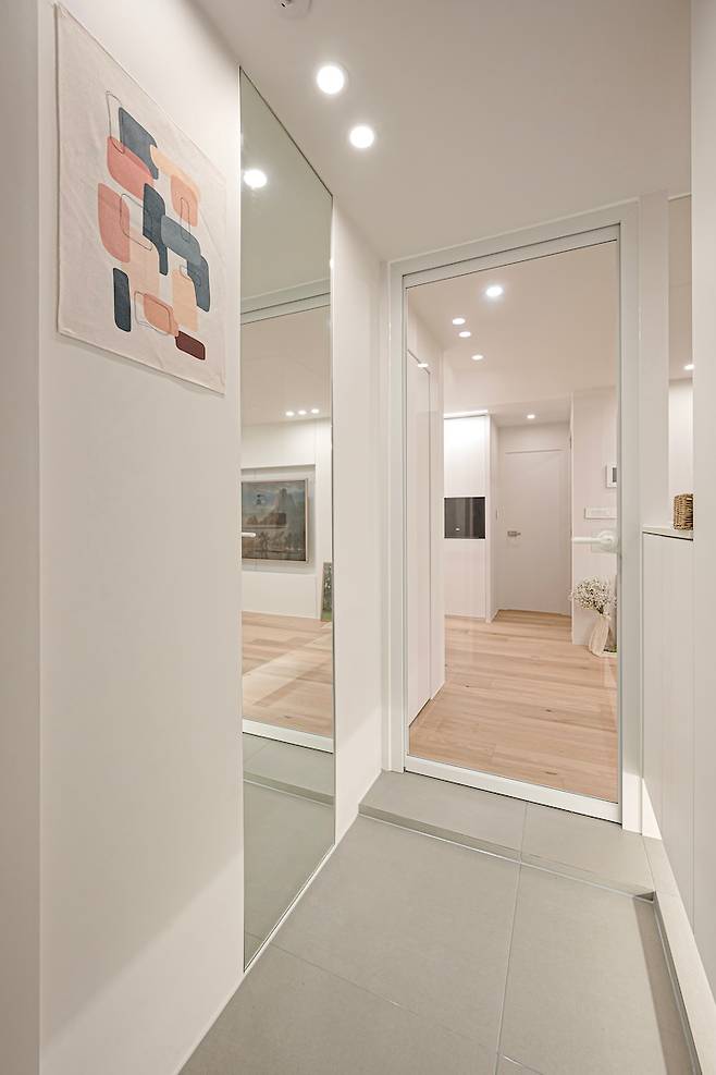 두꺼비집은 오늘의집에서 구매한 패브릭 포스터로 살짝 가려주었어요. 액자를 걸기에는 간섭이 많은곳이라서 가볍게 패브릭 포스터를 사용했어요. 거울은 길게 천장부터 바닥까지 이어지도록 넣었어요. 여기가 저희집 포토존이랍니다!
