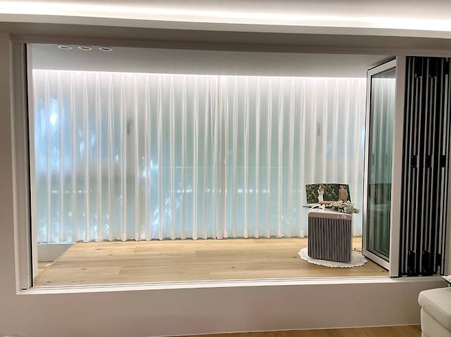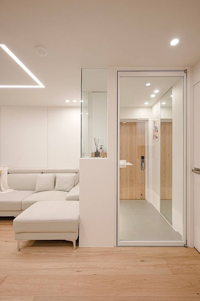 저희는 1층이라 중문은 필수였어요. 3연동 중문부터 아주 다양한 중문을 고민하다가, 아무 간섭도 없는 투명 통유리만 했는데, 너무너무 예쁜 것 같아요. 중문에서 보이는 집 내부도 예쁘고, 간섭이 없으니 더욱 개방감 있어 보이는 것 같아요.
