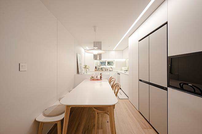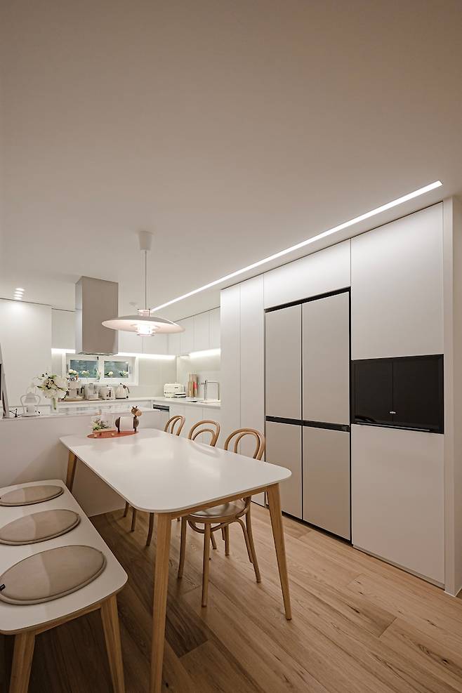 주방에 식탁 공간이 2400이 남아서, 2000짜리 식탁을 넣었어요. 벽면은 이왕 필름 바른 거 잘 보이게 등받이 의자로 안하고 벤치로 했는데, 앉기 편하고 더 좋은 것 같아요!