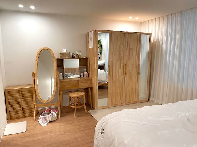 보기 싫었던 에어컨 배관도 네트와 넝쿨로 가렸고, 살다 보니 이것저것 소가구들을 채웠어요. 안방은 원래 미니멀하게 하려고 했었는데, 하나둘씩 채워지다 보니 어쩔수 없네요. ㅎㅎ 지금은 화장대를 빼서 다른 곳으로 옮길까 고민 중이랍니다 :) 군더더기 없이 이 정도로만 오래오래 유지했으면 참 좋을 것 같은데...