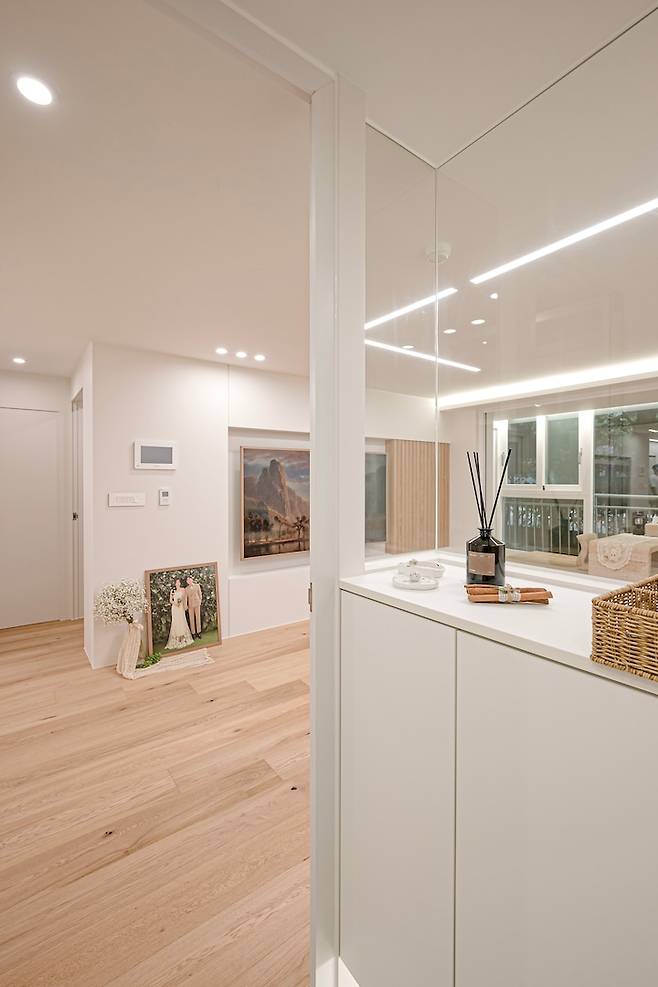 중문의 가벽을 전부 막아서 공간을 만들지 않고 가벽은 절반만 치고 절반은 유리로 가벽을 세웠는데, 집에 오는 사람들마다 이 부분이 특이하고 예쁘다고 칭찬이 많았어요. 유리 가벽은 시공사례가 많지 않아서 도전의 마음으로 시도했는데, 오브제로 꾸며놓으니 안에서도 밖에서도 예쁨을 볼 수 있어서 참 좋은 것 같아요. 개방감은 물론이고요!